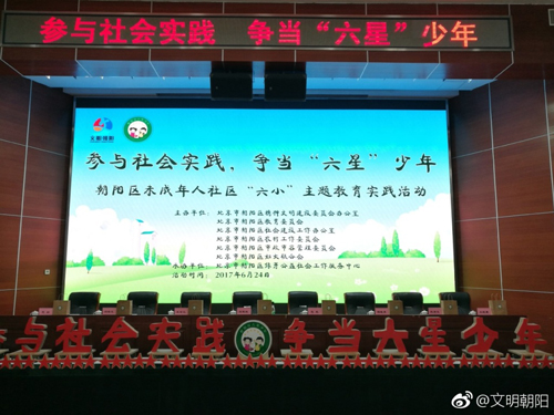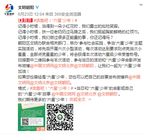 为积极培育和践行社会主义核心价值观,强化未成年人社区教育,朝阳区文明办联合相关部门决定在各街乡、社区(村)联合开展“参与社会实践,争当‘六星’少年”主题实践活动。“文明朝阳”发起“奔跑吧!‘六星’少年!”网络文明传播活动,线上活动结合线下活动,使活动形式更加丰富。