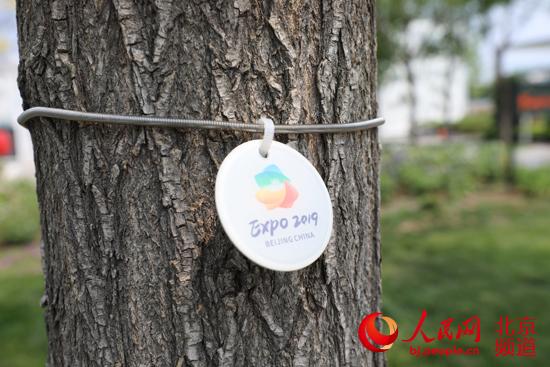 北京世园会园区中的树木悬挂上了这样的小标牌。人民网记者 尹星云 摄
