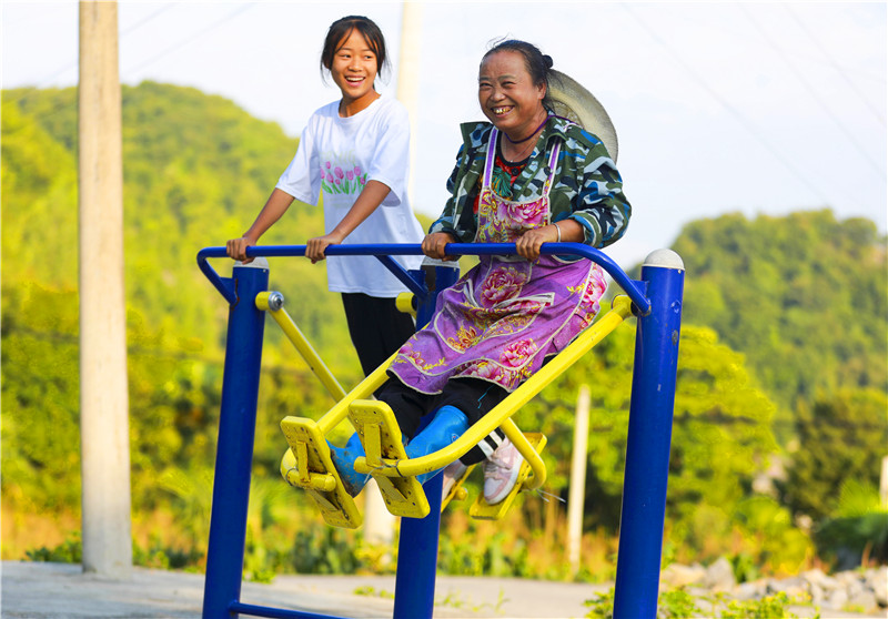老人和孩子在黔西市红林彝族苗族乡六斗村的健身小广场上健身