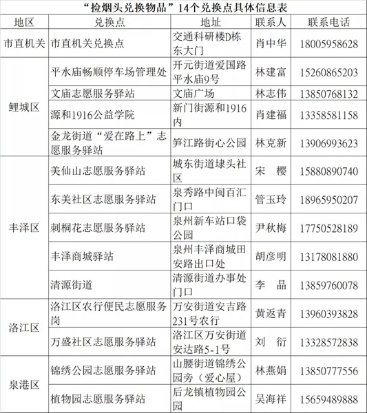 记者了解到,即日起,泉州市创城办、泉州市志愿者协会启动开展第二期的“烟头不落地、停车要有序”志愿服务暨烟头兑换活动,以固化群众讲卫生、守秩序的行为习惯,推动创建工作的常态长效。
