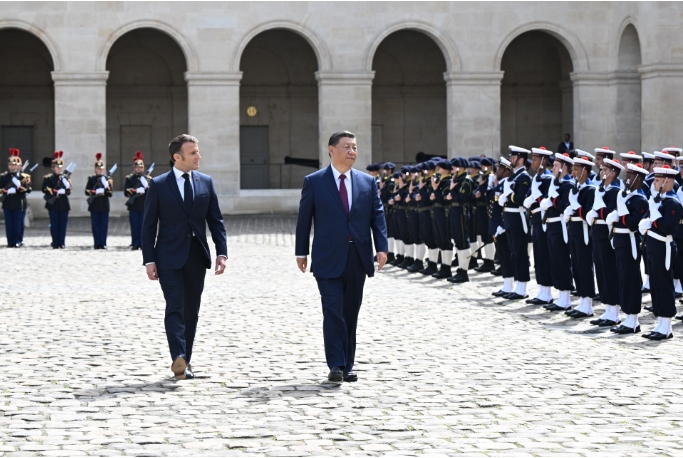 当地时间5月6日下午,正在法国进行国事访问的国家主席习近平在巴黎出席法国总统马克龙举行的隆重盛大欢迎仪式。这是两国元首检阅法兰西共和国卫队和陆海空三军仪仗队。新华社记者 谢环驰 摄