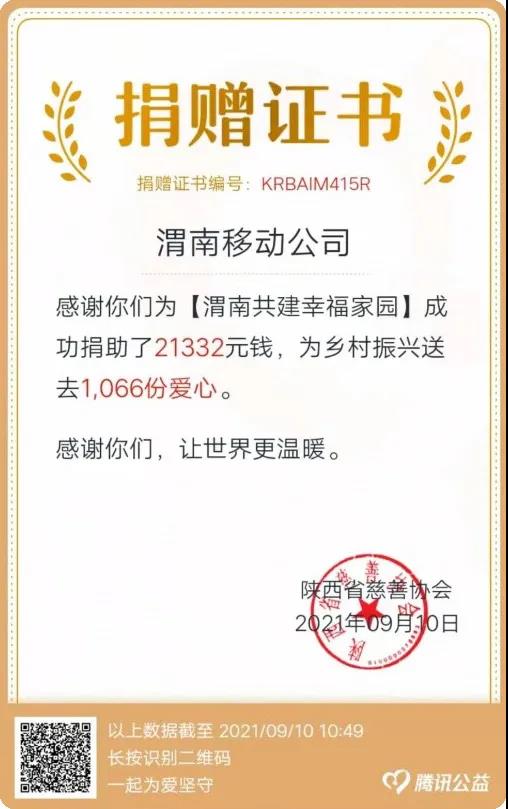 渭南移动分公司将持续为社会“办实事、办好事”,通过本次慈善募捐活动,进一步引导全体员工支持幸福家园建设和乡村振兴工作,将慈善行为转化为自觉意识,加强慈善宣传、壮大慈善实力、深化慈善救助。
