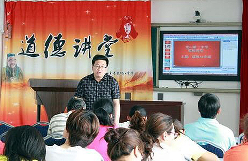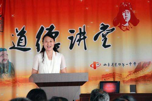 在龙口第一中学,与会老师在主持人的引领下,齐唱道德歌曲《感恩的心》,齐诵读道德经典《弟子规》,并观看短片《天堂的午餐》。在座的每一位老师都很受感动,很受鼓舞。在听取了王骏锋老师和陈秀丽老师的感人事迹之后,参加讲堂的其他老师分别发表了自己的道德感言。