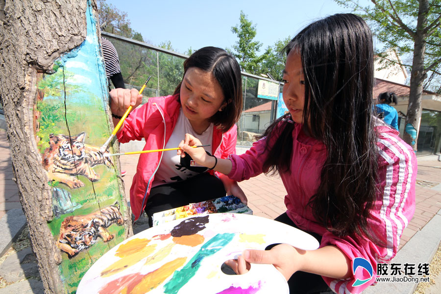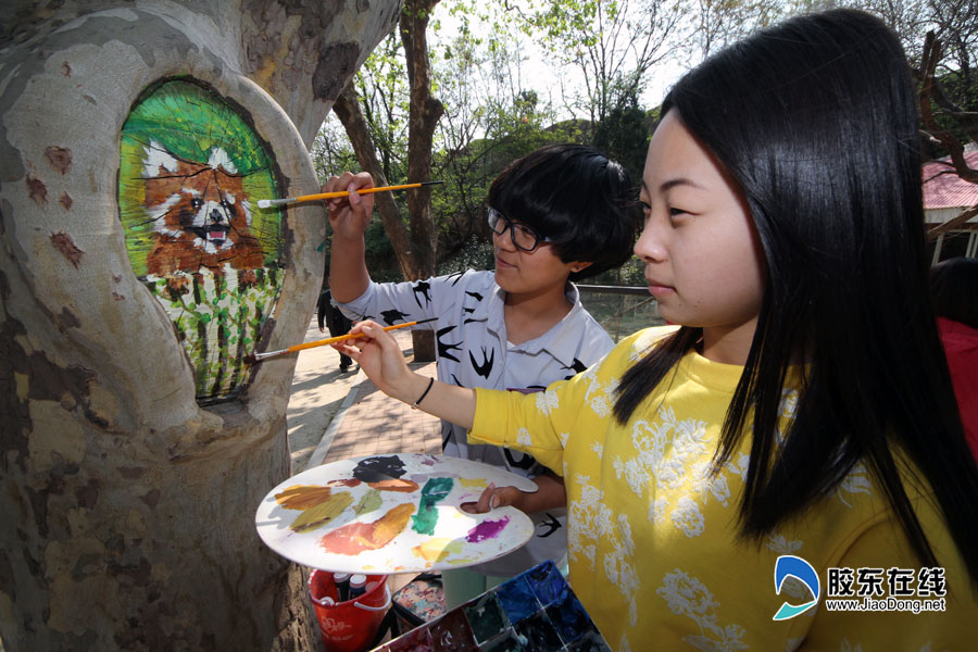 24日,烟台南山公园动物园内脱了皮的树上,出现了一些惟妙惟肖的美术作品,这些特殊的画作引来许多市民驻足观看。创意“树洞画”的作者是烟台大学的大学生,想要通过这种独特的艺术形式,在让南山公园风景变得更加生动和美丽的同时,宣传爱护环境和保护动物的环保理念。(胶东在线 魏琪/摄)