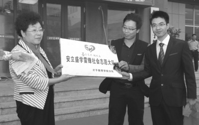 烟台文明网10月22日讯 10月18日,烟台芝罘区“安立盛学雷锋社会志愿大队才子教育学校分队”正式在才子教育学校揭牌,烟台市月亮姐姐公益发展中心许振珊为才子教育学校赠送“办好校外校、诚信育新人”的锦旗。