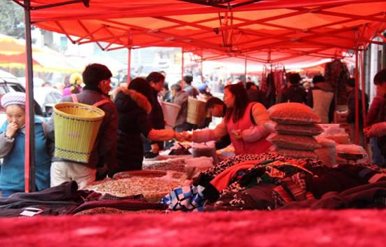 据悉,绥阳县每个乡镇的赶集日都有着各自的味道,在当地农村大集包罗万象,尤其是过年的大集,各种商品应有尽有。流连其间,只见柴米油盐酱醋茶、生熟肉制品、时蔬干货、水产海鲜、服装鞋帽、家具碗筷等年货一应俱全、应有尽有。在春节即将到来之际,最为耀眼的是那连片摆挂的对联、年画和“福”字,远远望去,红彤彤一片,集市显得分外红火热闹。(张秋霞)
