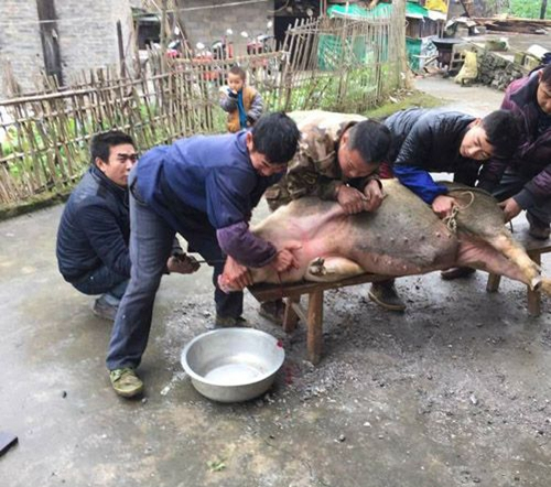 传来阵阵嚎叫,遥远的思绪拉回到现实,磕膝头洗得正好,有一家在杀猪,看来今天赶上了吃刨锅汤。赶紧拿出照相机,记录下这老王家过年杀猪的喜悦。(王 印 彭光杰)