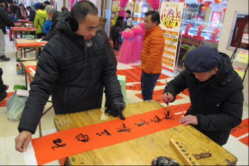背着一背篼年货,手捧着春联祝福的人们喜气洋洋地走出商场。他们内心的满足感和幸福感,来源于党和政府为人民服务的宗旨,来源于书法家们的不断坚持,勇于奉献精神。
