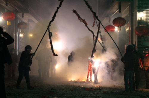 图为群众点燃鞭炮迎接“舞龙”